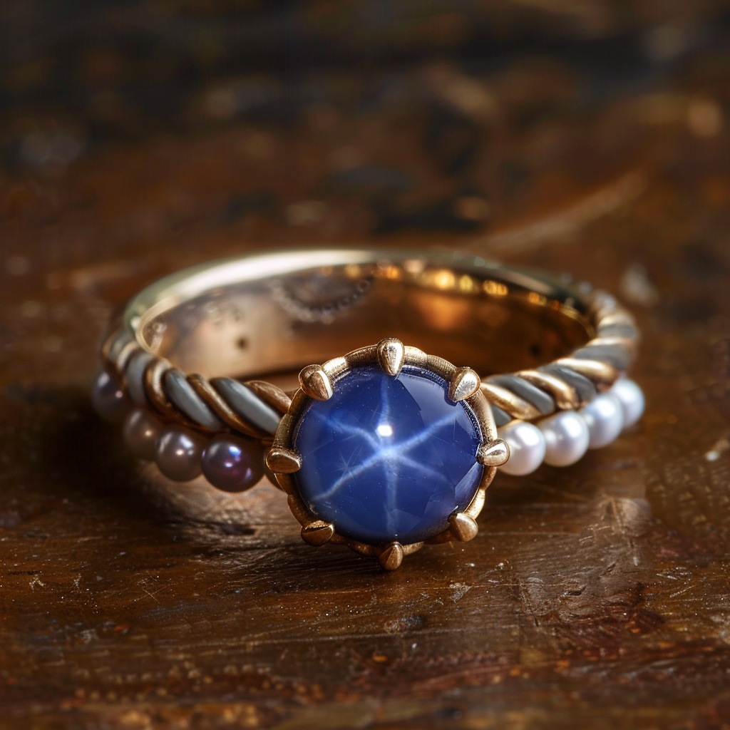 While we are applauding Rhyand's star-sapphire as the central stone, the accents of pearl are actually strongly not recommended to be used in engagement rings. They are soft and delicate, with a rating of just 2.5-4.5/10 on the Mohs scale. They can be easily scratched, dented, or damaged. We can imagine that over the centuries of this family heirloom ring, some of the accented pearls may have had to be replaced. Instead I would recommend an opaque/icy diamond that can have similar qualities to moonstones or salt and pepper diamonds that can appear like a sprinkle of stars in the night's sky.
