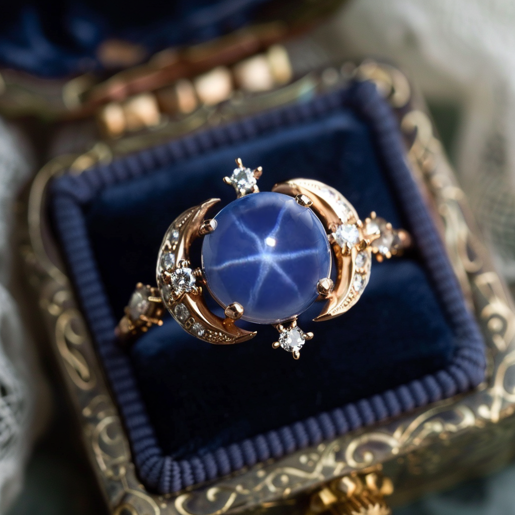 Rhysand’s choice of a blue sapphire, specifically star-sapphire, which exhibits a unique star-like phenomenon, represents the night's sky and the City of Starlight, Velaris, they call home. The star-sapphire symbolizes their destined connection, mutual guidance, and protection, reflecting their deep spiritual insight and intuition. The star within the gem stands for hope, faith, balance, and harmony in their relationship, highlighting how they complement and stabilize each other. Additionally, the gemstone's enduring nature and enchanting beauty mirror the magical, resilient love that defines their bond.